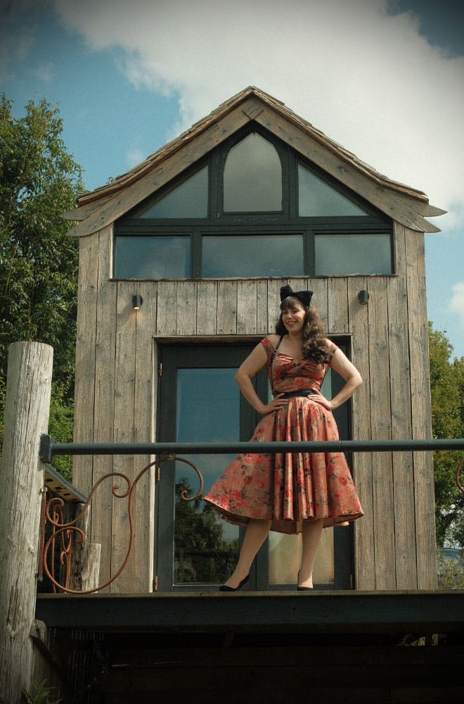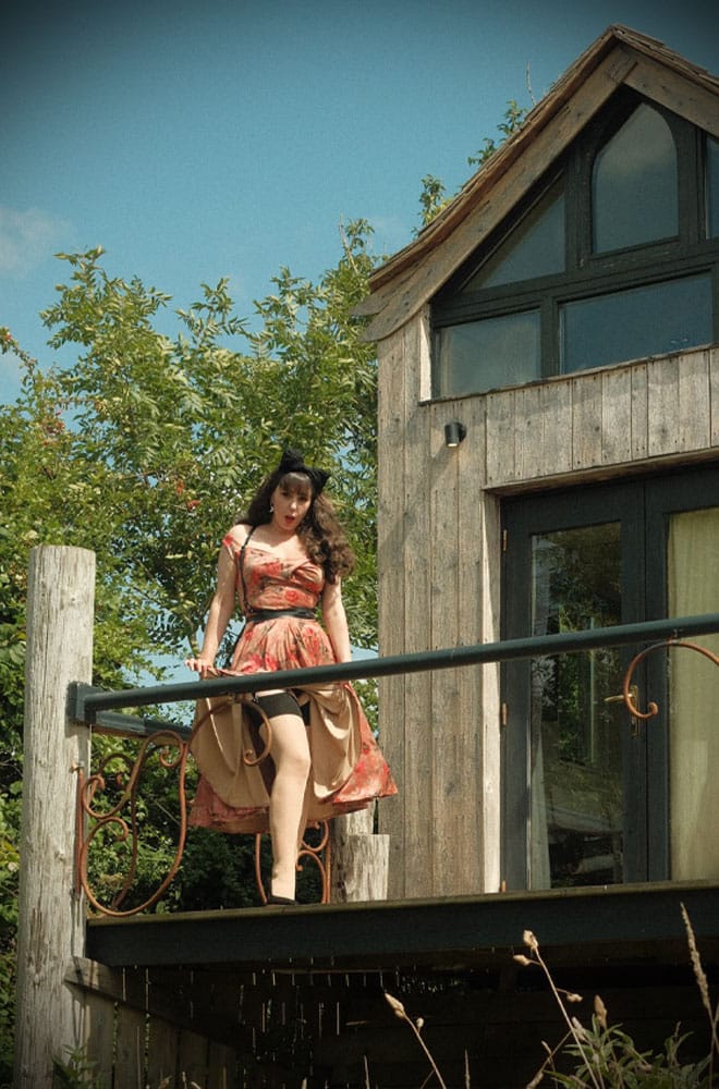 The Autumn Rose Velvet Aurora Swing Dress is new for Autumn/Winter and we are so excited. Cut in a luxurious dusky pink velvet, printed with romantic roses. Featuring a twist bust that is flattering to most bust sizes, this dress really turns heads. The wide straps can be comfortably worn on or off the shoulders. The fit is snug through the body, designed to help create the perfect hourglass silhouette. The skirt is full and it moves beautifully. Wear it as it is or add a petticoat for maximum drama! Naturally, the skirt features hidden pockets.