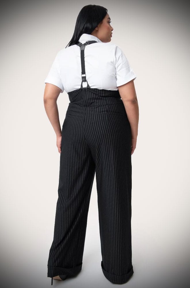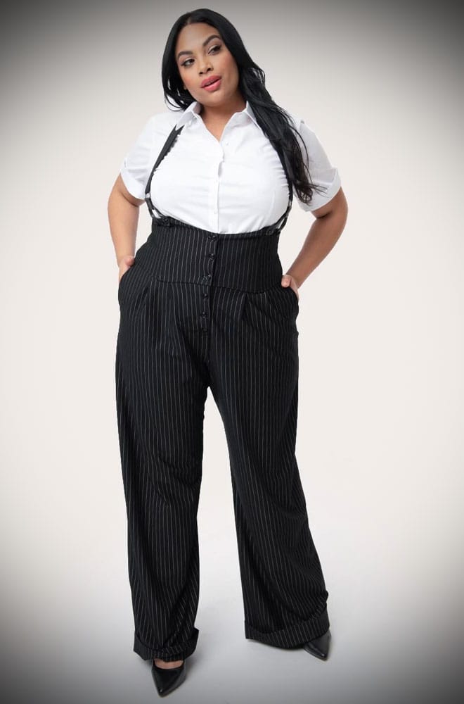The Black Pinstripe Thelma Trousers are the super high-waisted suspender trousers of our dreams! Cut in inky black fabric with white pinstripes, these vintage-inspired pants feature a wide-banded high waist, cinched in with a darling button-up front and secured by adjustable braces. The braces are also easily removable, for versatile wear. They feature deep side pockets as well as wide legs with rolled cuffs. These high-waisted vintage pants are the perfect complement to your 1930s wardrobe but feel free to put your own spin on the look too! We love the idea of wearing them with a sassy t-shirt.
