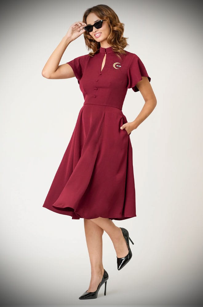 The Evil Eye Swing Dress is a chic dress in lightweight burgundy fabric. It features a dramatic embroidered evil eye and moon on the bust. The lovely button-up front is framed by a charming high collar and floating cap sleeves. The bodice is darted for a neat fit, and the paneled A-line swing skirt swishes delightfully around your knees. Finished with hidden side pockets and a zip in the centre-back.