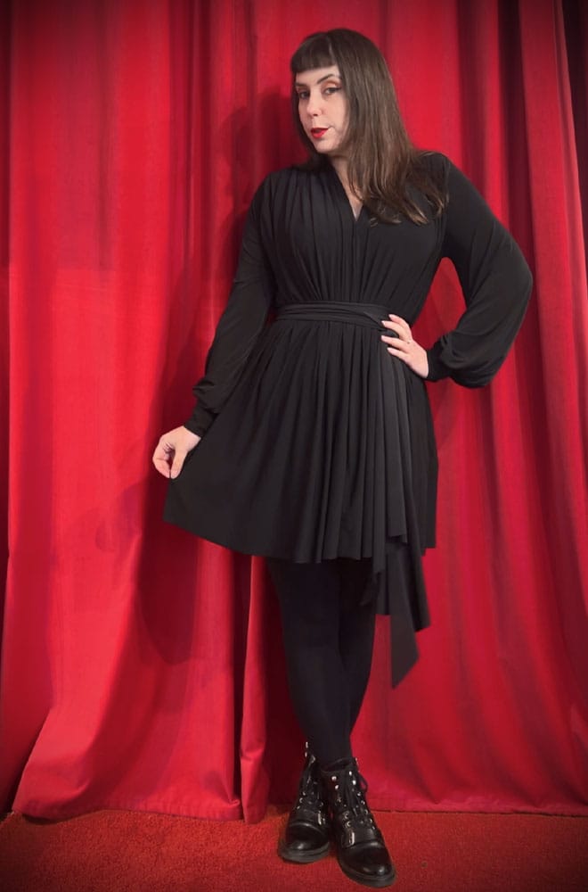 The Claudina Mini Dress is a draped, silky jersey dress with a sash tie waist and bishop sleeves. This new length is cut for maximum sass - finishing high on your thigh. It features a V-neck, which can be either modest or more daring, depending on how you tweak the gathers that run through the body of the dress. The lustrous black fabric is soft and slinky, which makes this dress feel opulent and sophisticated. You'll also find hidden pockets - our all-time favourite finishing touch!